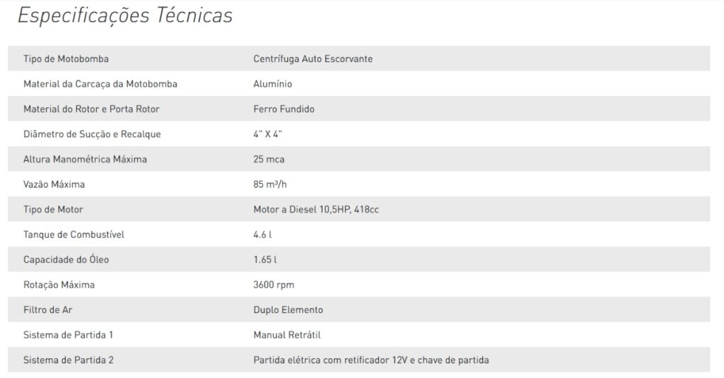 A Motobomba Auto Escorvante Toyama TDWP100SEXP, foi desenvolvida para o uso profissional. É equipada com motor Diesel de 10.5 HP de potência máxima, com partida manual e elétrica.Fabricada com materiais de alta resistência e durabilidade, possui corpo em alumínio com diâmetro de sucção de 4″ e diâmetro de recalque de 4″. O rotor e voluta são confeccionados em ferro fundido. Conta com quadro tubular que protege o conjunto e facilita o transporte.Esse tipo de bomba tem como característica realizar a transferência de grandes volumes de água, com baixa pressão.Atende as demandas profissionais como: abastecimentos de tanque agrícolas, caminhões pipas, tanques de combate a incêndio, esvaziamento de pequenos lagos ou tanques de peixes, entre outras situações onde se fizer necessário.